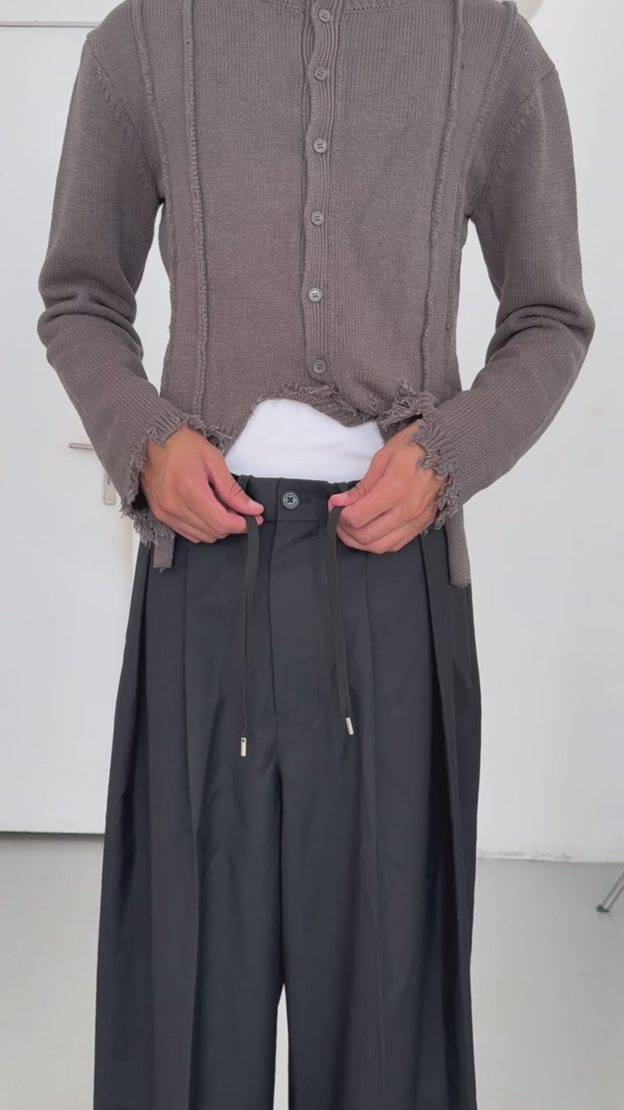 Tokyo Tailored Pants — Wide-leg black tailored trousers cut for balance and fluidity. Designed with double front pleats for volume, a mid-rise waist, and a hidden drawcord threaded through the waistband for a personalized fit. Side pockets, belt loops, and soft structure make them a modern staple that moves easily between settings.